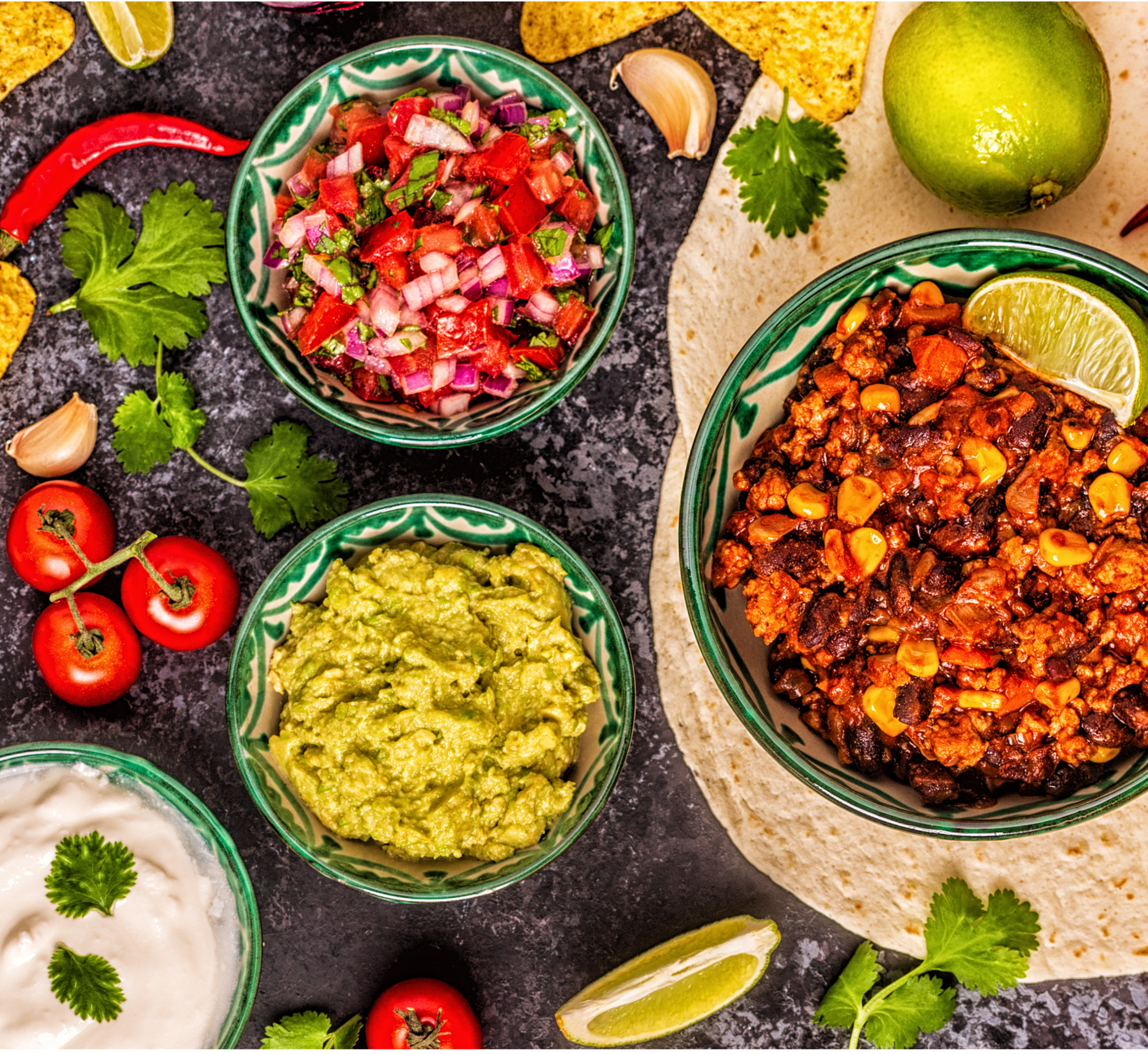 Optional sides: Guacamole, salsa, tomato, lettuce, grated carrot, grated cheese, and plain yoghurt.